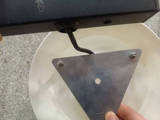 13、安裝固定圓盤支架并穿線,先將圓盤支架中間四個螺絲拆卸,然后將圓盤支架從燈桿上方套到燈桿上,光照傳感器朝向控制箱方向,將傳感器線從對應的進線孔(距燈桿頂端1m)穿進燈桿,從控制箱的出線孔(離燈桿底座1.2m)穿出燈桿,最后將圓盤支架4個穿線孔與燈桿的4個進線孔對齊,固定4個螺絲并擰緊,注意不要壓到線