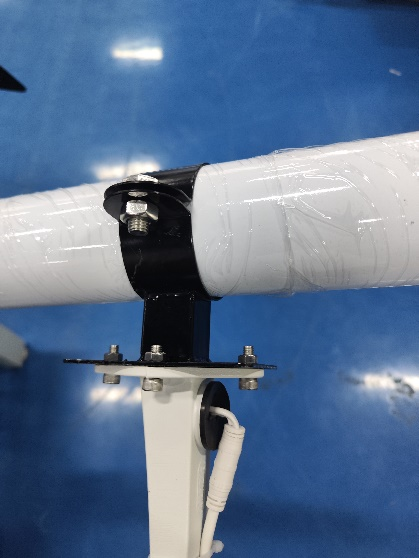 14、安裝固定槍機攝像頭,將槍機與槍機支架(白色)固定,槍機線穿入槍機支架內,連接一根網線(7m藍色網線)及電源線(DC插頭線),然后與槍機連接件(黑色)固定,接頭留在槍機支架內(接頭用防水膠布纏住),最后將網線、電源線從燈桿頂部30cm穿線孔處穿入燈桿,從控制箱的出線孔(離燈桿底座1.2m)穿出燈桿,將連接件與燈桿固定完成