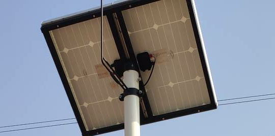 15、安裝固定電池板并穿線,將電池板線從燈桿頂端進線孔穿進燈桿,從控制箱出線孔(離燈桿底座1.2m)穿出,然后將電池板支架套入燈桿內,固定三個螺絲并擰緊,注意電池板朝向南(以控制箱方向為基準)